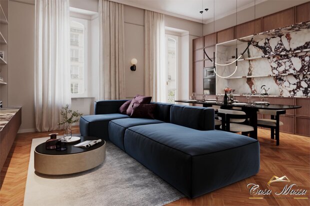 L'ingresso, ampio ed elegante, introduce con naturalezza le diverse aree della casa. La zona giorno con cucina a vista, di circa 40 metri quadri risulta straordinariamente luminosa grazie alla finestra ed al balcone con affaccio diretto su via Bertola, elemento che dona profondità e luce costante agli spazi. La zona notte è garantita dalle due ampie camere da letto, entrambe affacciate sul silenzioso interno corte attraverso un lungo balcone che percorre l'intera facciata interna. A completare l'alloggio vi sono due ampi bagni finemente rifiniti e una cabina armadio.