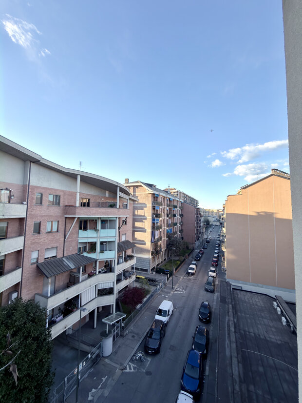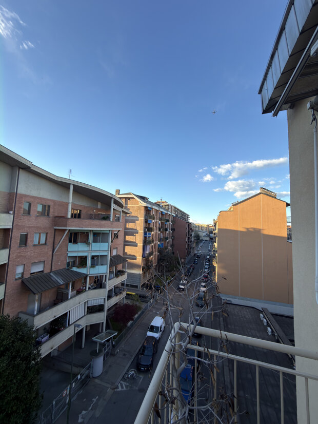 L'immobile si trova al quarto piano senza ascensore e gode di una piacevole doppia esposizione. L'ingresso si apre sulla zona giorno con cucina a vista, uno spazio accogliente e ben distribuito. La camera da letto è particolarmente ampia e luminosa, con accesso al balcone che affaccia direttamente sulla via. Il bagno, di generose dimensioni, è dotato di un secondo balcone con affaccio sull'interno cortile, risultando quindi ben arieggiato e funzionale.