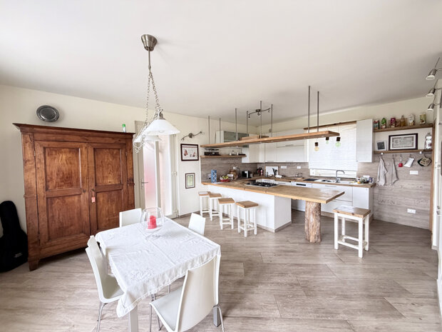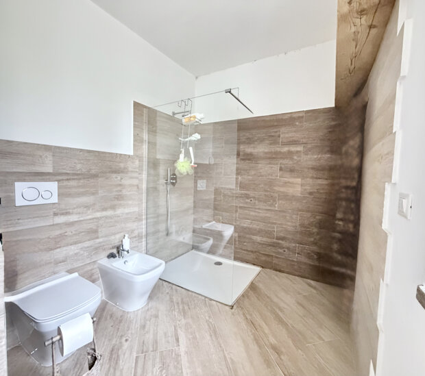 A fianco si trova una tettoia di 60 mq, attualmente utilizzata come terrazzino coperto, con possibilità di trasformazione in abitazione su due livelli per circa 120 mq con ingresso indipendente.