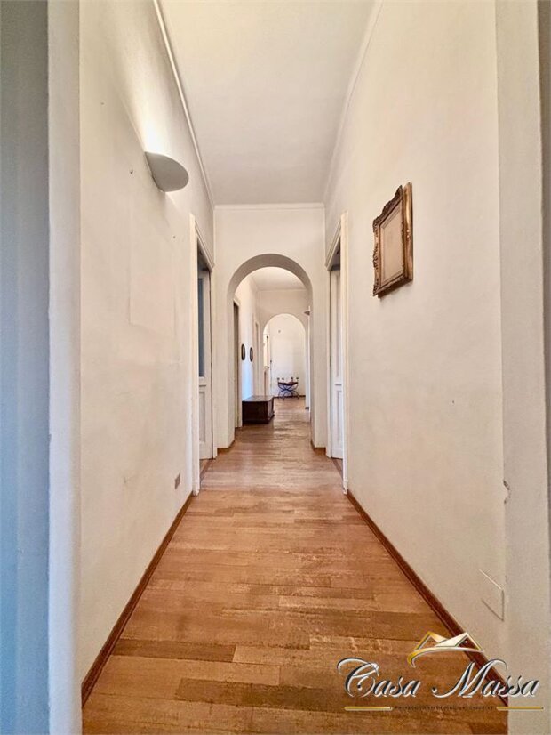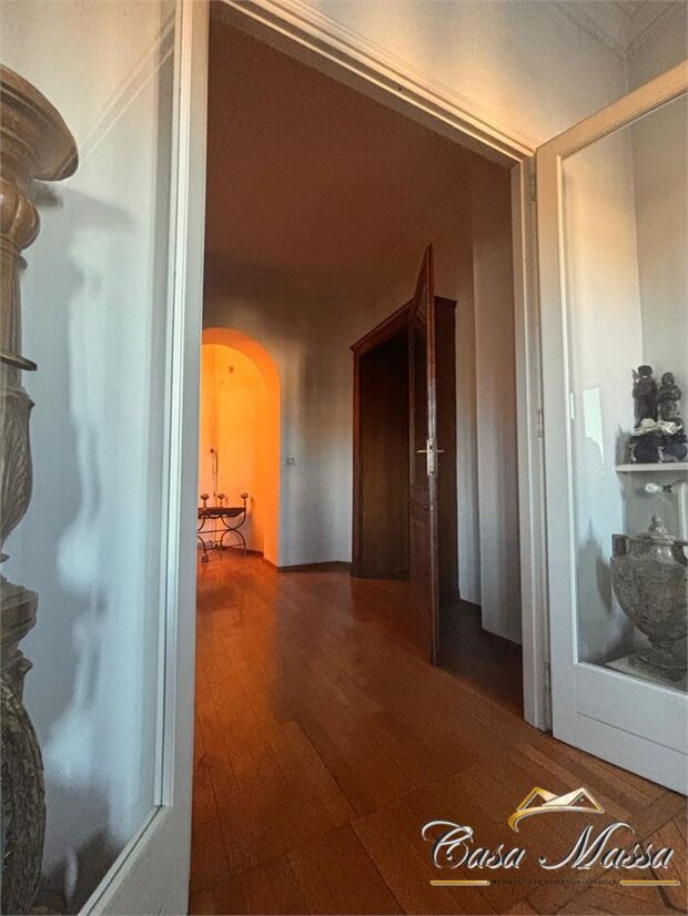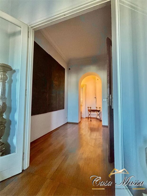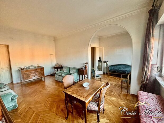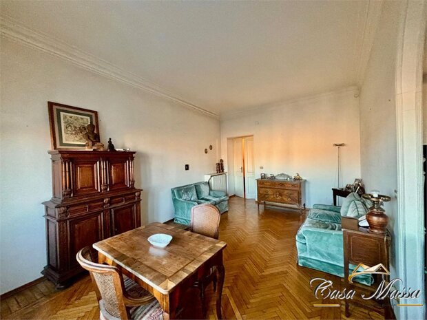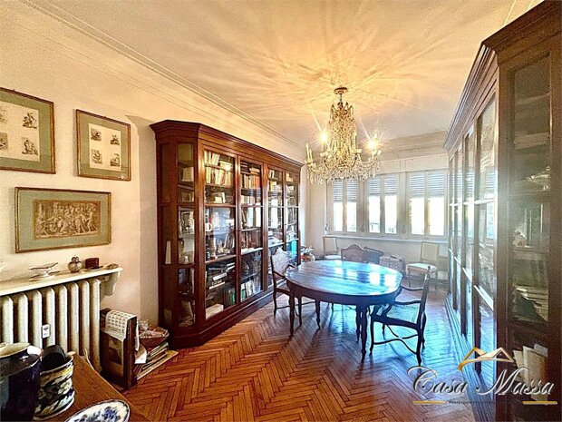 La proprietà, di elevato standing, si sviluppa su una superficie commerciale di circa 200 mq e si distingue per una distribuzione interna armoniosa e funzionale, improntata a criteri di signorilità. L'ampio ingresso introduce con eleganza agli ambienti principali, consentendo un'immediata accoglienza verso il salone di rappresentanza oppure accompagnando, attraverso un corridoio centrale di sviluppo longitudinale, alla zona più riservata dell'abitazione, con collegamenti fluidi e razionali tra i vari spazi. Le grandi superfici vetrate, incorniciate da serramenti in legno di foggia tradizionale, valorizzano la doppia esposizione, affacciandosi da un lato su corso Re Umberto e dall'altro sulla corte interna, dove si apre un'ampia balconata. Tale configurazione garantisce un'eccellente luminosità naturale e una piacevole ventilazione trasversale. Il salone principale, con affaccio diretto sul largo alberato, gode di una vista aperta, riservata e di particolare fascino, rappresentando uno degli elementi più qualificanti della residenza. I pavimenti in parquet, omogenei su tutta la superficie, conferiscono continuità ed eleganza agli ambienti, che risultano ampi, ben proporzionati e facilmente adattabili a differenti esigenze abitative. L'unità immobiliare si compone di ingresso, soggiorno, ampia sala da pranzo, quattro camere da letto, cucina, doppi servizi e locali accessori. L'immobile si presenta in buono stato manutentivo, pur offrendo interessanti opportunità di personalizzazione attraverso interventi di riqualificazione impiantistica e di aggiornamento funzionale, ideali per esaltarne ulteriormente il carattere ed il pregio. Completano la proprietà una cantina al piano interrato e il servizio di portineria dello stabile.